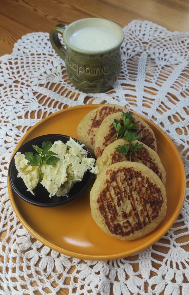 Przygotowanie: Ugotowanie ziemniaki przeciśnij przez praskę lub dokładnie ugnieć tłuczkiem, następnie dodaj maślankę, sól i maślankę. Zagnieć dokładnie ciasto. Uformuj okrągłe placki grubości około 2 cm. Jeśli ciasto się lepi, posmaruj dłonie delikatnie olejem, ale nie dodawaj do ciasta więcej mąki. Smaż placki na średnim ogniu na patelni beztłuszczowej do zarumienienia. Możesz wrzucić je też do rozgrzanego piekarnika do 180 stopni na ok. 30 minut. Powinny być lekko chrupiące z wierzchu, a miękkie w środku.